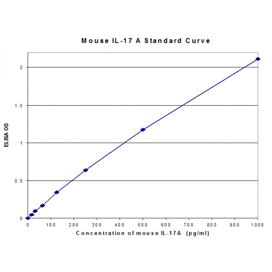 This mouse IL-17A ELISA is a 3.5-hour solid phase immunoassay readily applicable to measure mouse IL-17A levels in cell culture supernatant and mouse serum in the range of 0 to 1000 pg/mL. It showed no cross reactivity with other cytokines tested. This mouse IL-17A ELISA is expected to be effectively used for further investigations into the relationship between IL-17A and the various conditions mentioned.