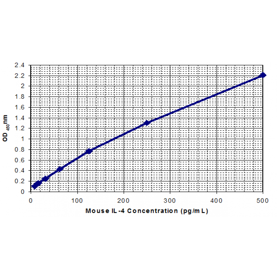 In order to measure the concentration of mouse IL-6 in the samples, this kit contains two calibration diluents (Calibrator Diluent I for serum/plasma testing and Calibrator Diluent II for cell culture supernatant/ urine testing). According to the testing system, the provided standard is diluted (2-fold) with the appropriate Calibrator Diluent and assayed at the same time as the samples. This allows the operator to produce a standard curve of Optical Density (O.D.) versus IL-6 concentration (pg/mL). The concentration of IL-6 in the samples is then determined by comparing the O.D. of the samples to the standard curve.