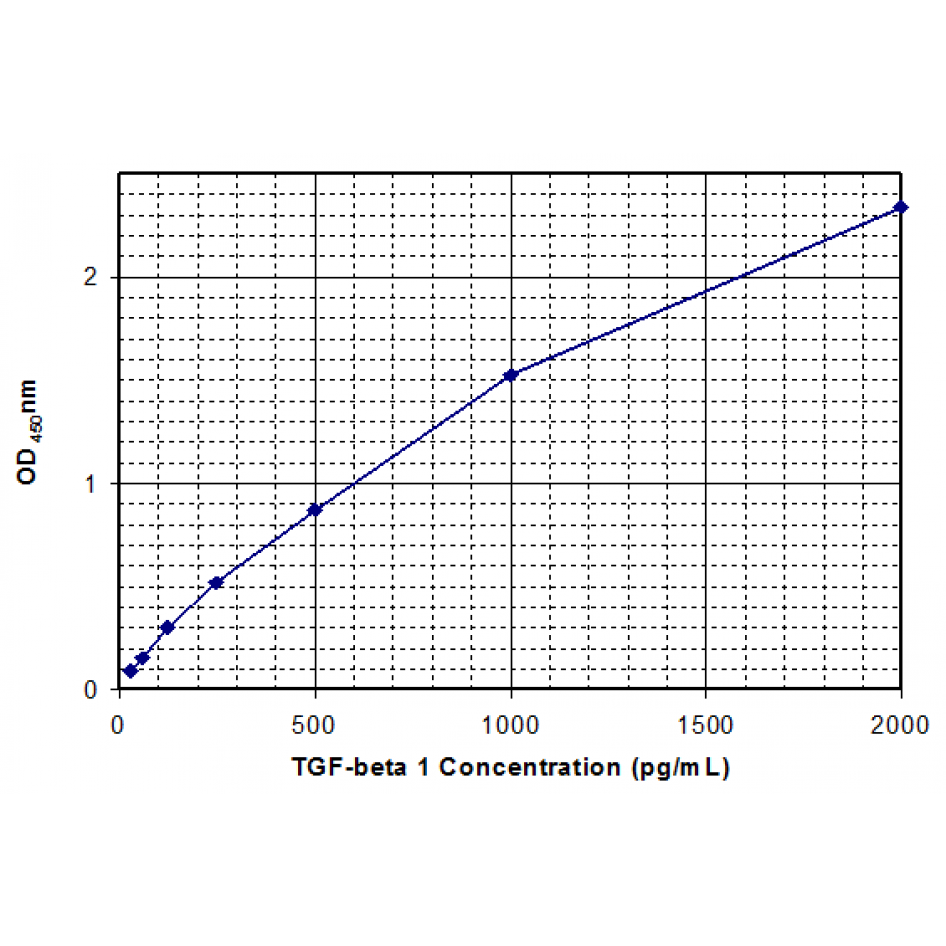 In order to measure the concentration of TGF-β1 in the samples, this kit includes two calibration diluents (Calibrator Diluent I for serum/plasma testing and Calibrator Diluent II for cell culture supernatant testing.) According to the testing system, the provided standard is diluted (2-fold) with the appropriate Calibrator Diluent and assayed at the same time as the samples. This allows the operator to produce a standard curve of Optical Density (O.D) versus TGF-β1 concentration (pg/mL). The concentration of TGF-β1 in the samples is then determined by comparing the O.D. of the samples to the standard curve.